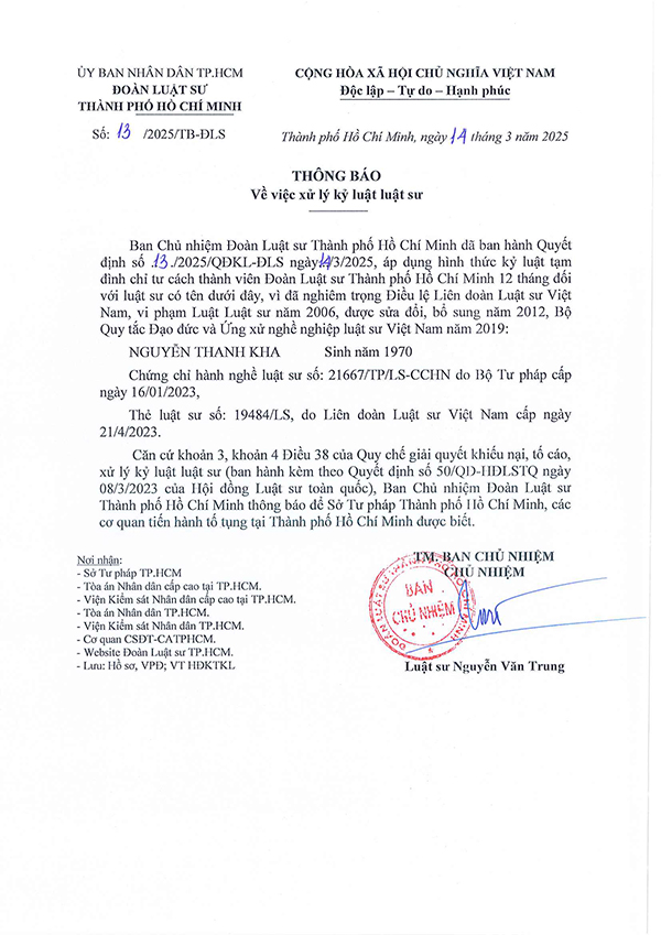 THÔNG BÁO VỀ VIỆC XỬ LÝ KỶ LUẬT LUẬT SƯ NGUYỄN THANH KHA