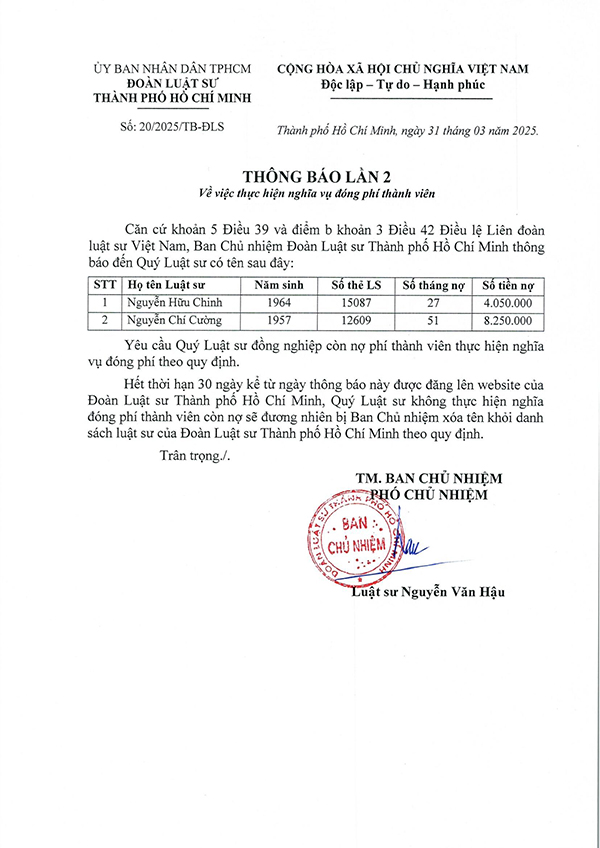 THÔNG BÁO LẦN 2 VỀ VIỆC THỰC HIỆN NGHĨA VỤ ĐÓNG PHÍ THÀNH VIÊN