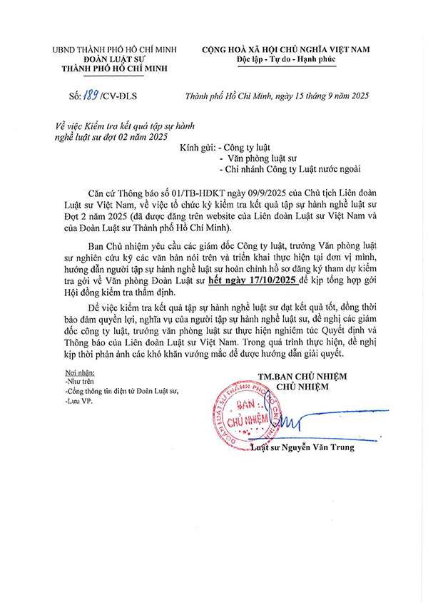 VỀ VIỆC KIỂM TRA KẾT QUẢ TẬP SỰ HÀNH NGHỀ LUẬT SƯ ĐỢT 02 NĂM 2025