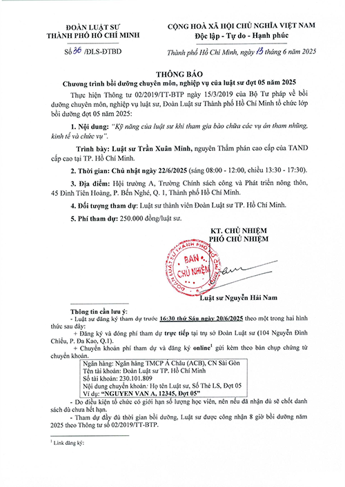 THÔNG BÁO CHƯƠNG TRÌNH BỒI DƯỠNG CHUYÊN MÔN, NGHIỆP VỤ CỦA LUẬT SƯ ĐỢT 05 NĂM 2025