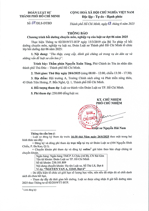 THÔNG BÁO CHƯƠNG TRÌNH BỒI DƯỠNG CHUYÊN MÔN, NGHIỆP VỤ CỦA LUẬT SƯ ĐỢT 06 NĂM 2025