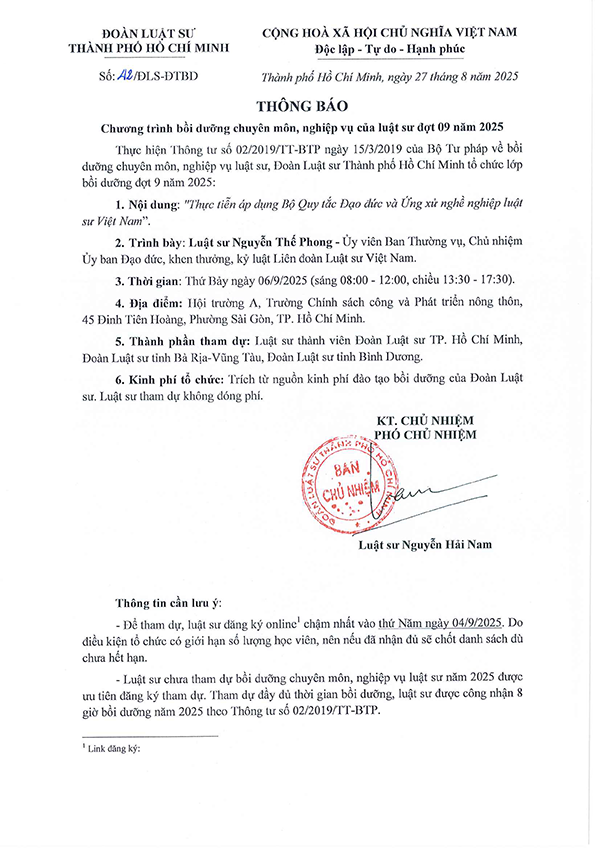 THÔNG BÁO CHƯƠNG TRÌNH BỒI DƯỠNG CHUYÊN MÔN, NGHIỆP VỤ CỦA LUẬT SƯ ĐỢT 09 NĂM 2025 (LỚP BỒI DƯỠNG ĐĂNG KÝ ĐỦ SỐ LƯỢNG HỌC VIÊN))