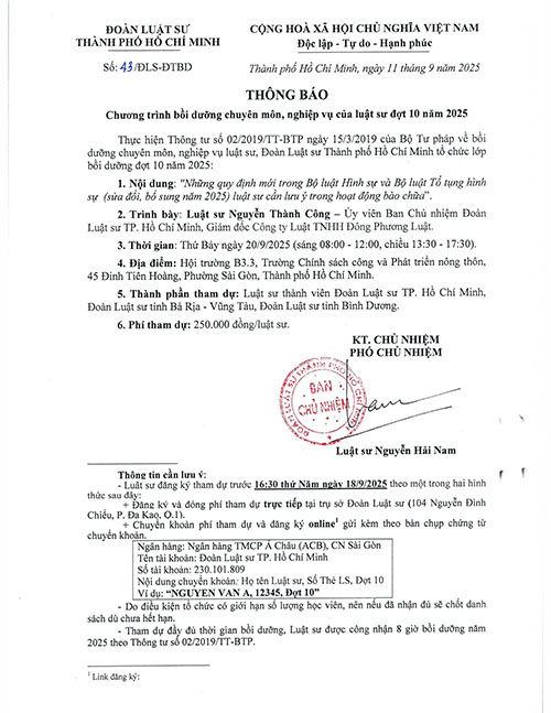 THÔNG BÁO CHƯƠNG TRÌNH BỒI DƯỠNG CHUYÊN MÔN, NGHIỆP VỤ CỦA LUẬT SƯ ĐỢT 10 NĂM 2025