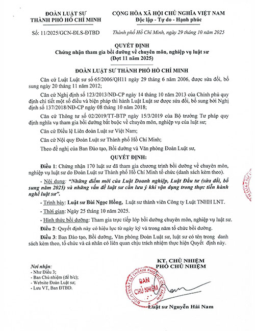 QUYẾT ĐỊNH CHỨNG NHẬN THAM GIA BỒI DƯỠNG VỀ CHUYÊN MÔN, NGHIỆP VỤ CỦA LUẬT SƯ NGÀY ĐỢT 11- NGÀY 25-10-2025