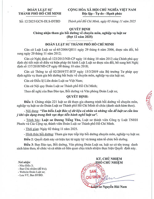 QUYẾT ĐỊNH CHỨNG NHẬN THAM GIA BỒI DƯỠNG VỀ CHUYÊN MÔN, NGHIỆP VỤ CỦA LUẬT SƯ NGÀY ĐỢT 12- NGÀY 02-11-2025