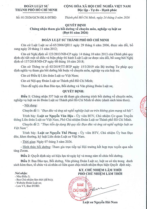 QUYẾT ĐỊNH CHỨNG NHẬN THAM GIA BỒI DƯỠNG VỀ CHUYÊN MÔN, NGHIỆP VỤ CỦA LUẬT SƯ NGÀY ĐỢT 01- NGÀY 07-03-2026
