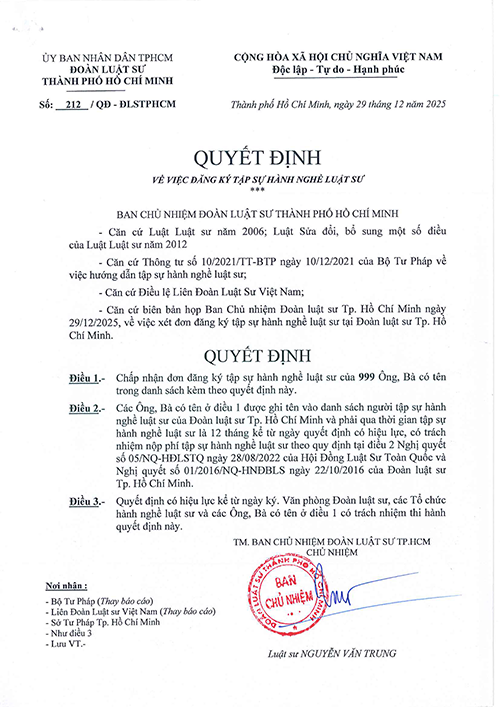 QUYẾT ĐỊNH CÔNG NHẬN TẬP SỰ HÀNH NGHỀ LUẬT SƯ ĐỢT 45