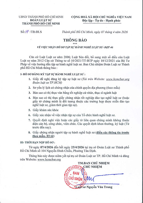 THÔNG BÁO VỀ VIỆC NHẬN HỒ SƠ TẬP SỰ HÀNH NGHỀ LUẬT SƯ- ĐỢT 46