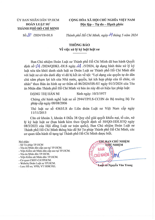 THÔNG BÁO VỀ VIỆC XỬ LÝ KỶ LUẬT LUẬT SƯ ĐẶNG THỊ HÀN NI
