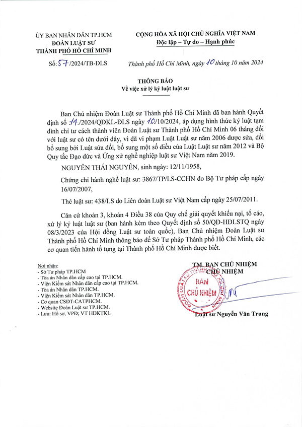 THÔNG BÁO VỀ VIỆC XỬ LÝ KỶ LUẬT LUẬT SƯ NGUYỄN THÁI NGUYÊN