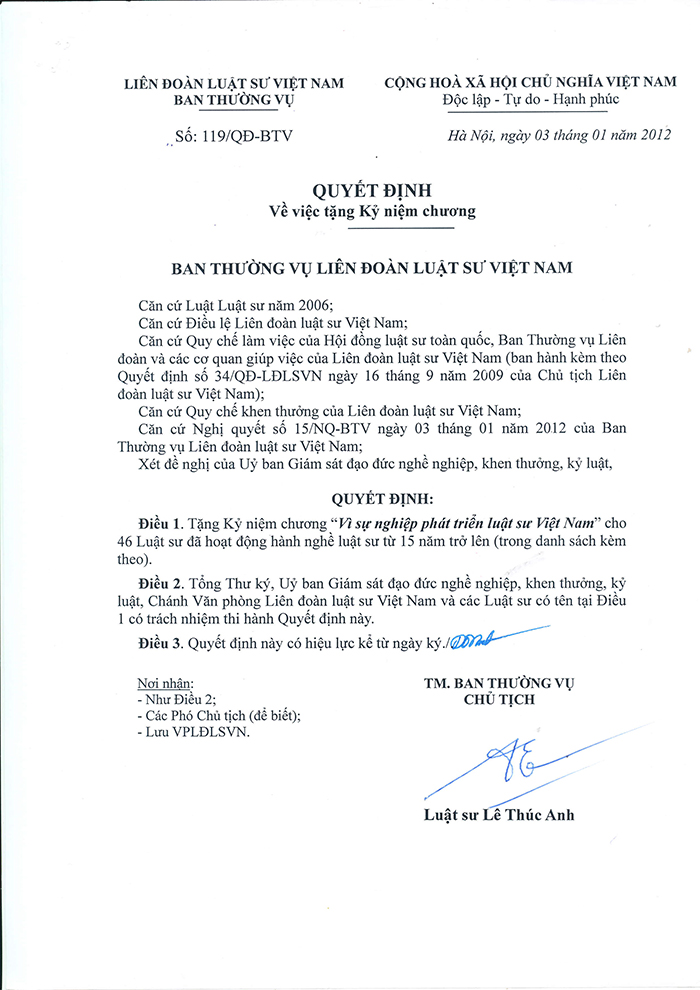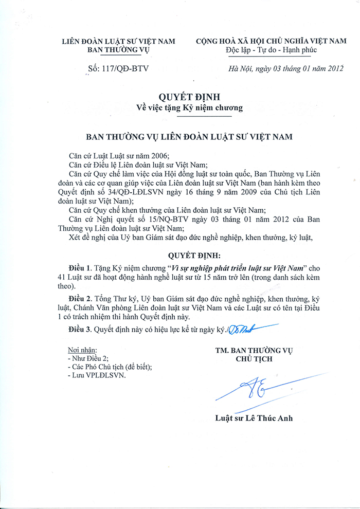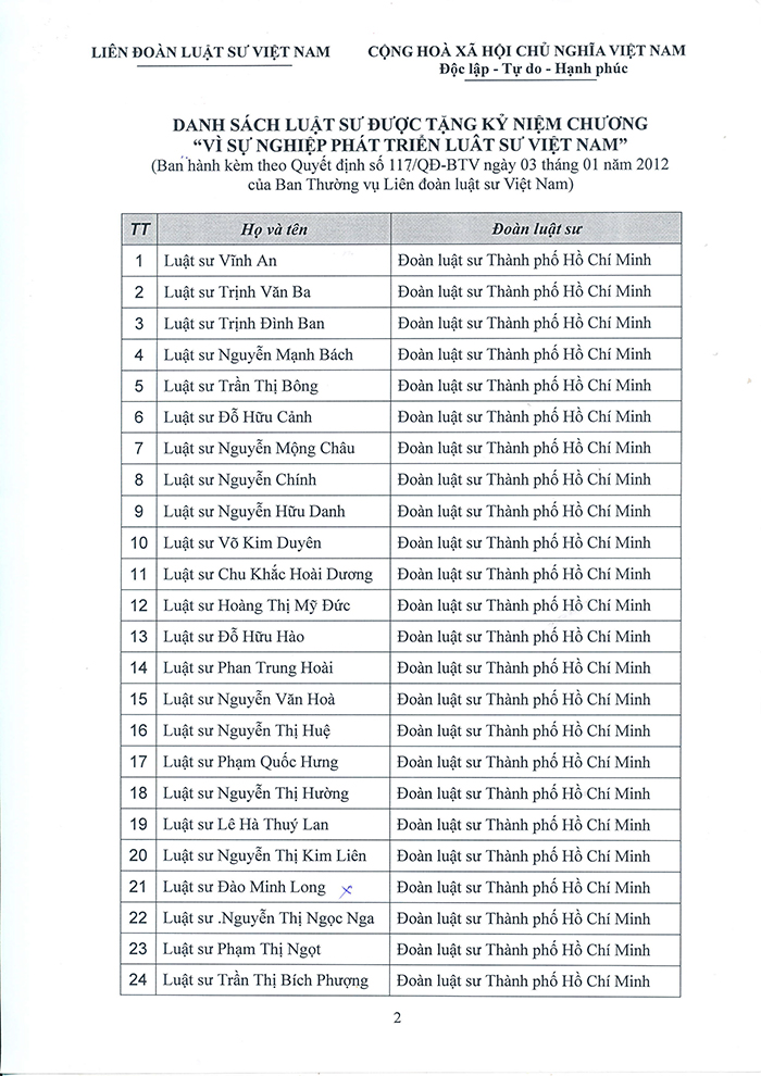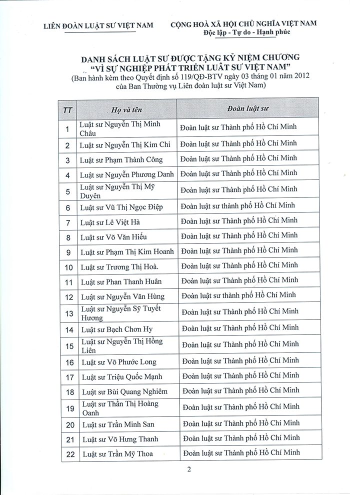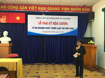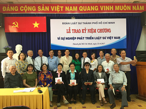 (ĐLSTP.HCM): Ngày 22/04/2017, Đoàn Luật sư Thành phố Hồ Chí Minh đã tổ chức Lễ trao Kỷ niệm chương Vì sự nghiệp phát triển luật sư Việt Nam do Liên đoàn luật sư Việt Nam tặng cho 82 luật sư là thành viên của Đoàn. Tham dự buổi lễ, có các luật sư được trao tặng Kỷ niệm chương, đại diện Ban Chủ nhiệm (Luật sư Chủ nhiệm Nguyễn Văn Trung, các Phó Chủ nhiệm: Luật sư Trần Mỹ Thoa, Luật sư Nguyễn Hải Nam, Ủy viên Ban Chủ nhiệm Phan Thị Hồng Điểm) và đại diện Hội đồng khen thưởng, kỷ luật (Luật sư Nguyễn Bảo Trâm - Chủ tịch Hội đồng và Luật sư Trần Thị Tuyết- Phó Chủ tịch Hội đồng).