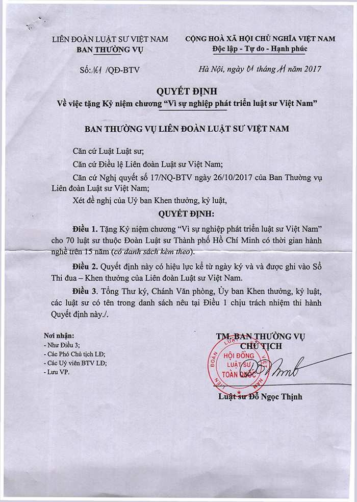 70 LUẬT SƯ ĐƯỢC TRAO KỶ NIỆM CHƯƠNG “VÌ SỰ NGHIỆP PHÁT TRIỂN LUẬT SƯ VIỆT NAM”