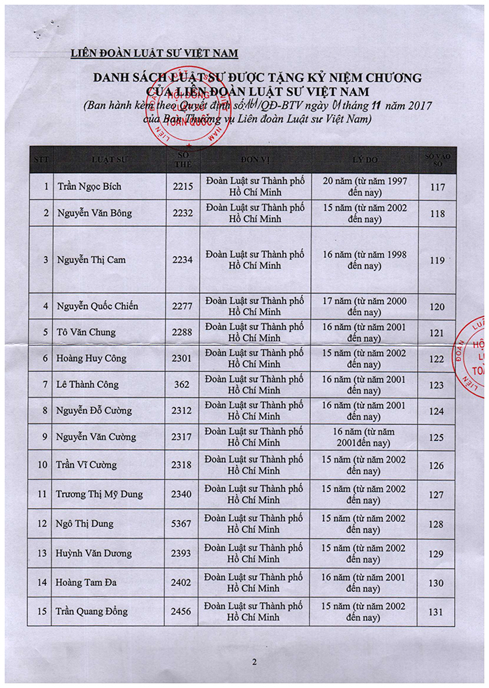 Dịp này, có 70 luật sư thuộc Đoàn Luật sư TPHCM được trao Kỷ niệm chương “Vì sự nghiệp phát triển luật sư Việt Nam” của Liên đoàn luật sư Việt Nam; 12 cá nhân nhận Kỷ niệm chương của Bộ Tư pháp vì đã có nhiều công lao, đóng góp xây dựng ngành Tư pháp Việt Nam.