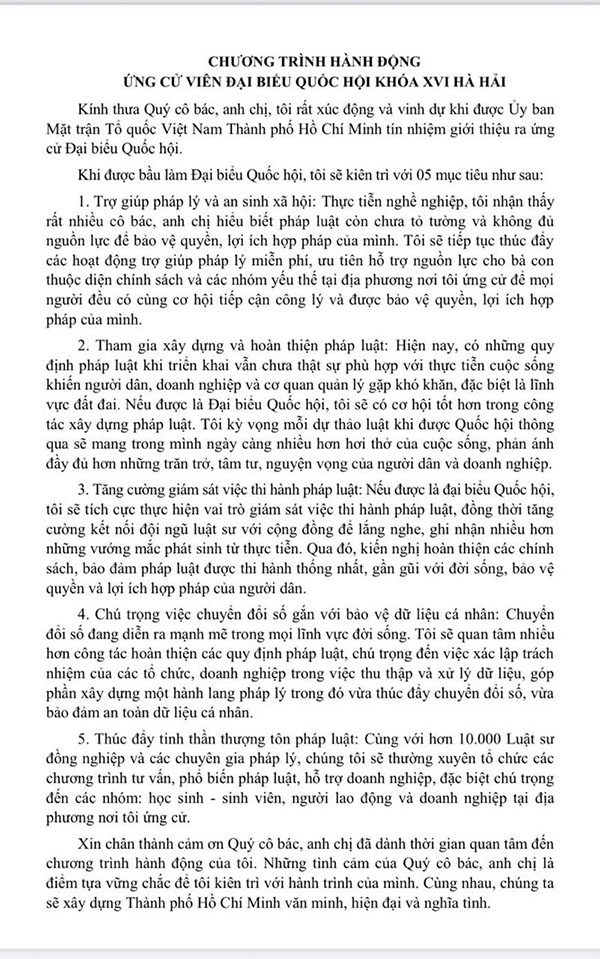 LUẬT SƯ HÀ HẢI ỨNG CỬ ĐẠI BIỂU QUỐC HỘI KHÓA XVI TẠI ĐƠN VỊ BẦU CỬ SỐ 10, THÀNH PHỐ HỒ CHÍ MINH