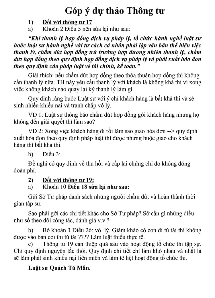 GÓP Ý DỰ THẢO THÔNG TƯ (Hướng dẫn tập sự hành nghề luật sư _ Dự thảo ngày 19.02.2020)