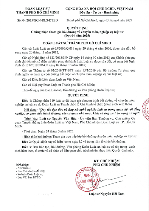 QUYẾT ĐỊNH CHỨNG NHẬN THAM GIA BỒI DƯỠNG VỀ CHUYÊN MÔN, NGHIỆP VỤ CỦA LUẬT SƯ NGÀY 24-5-2025 ĐỢT 04