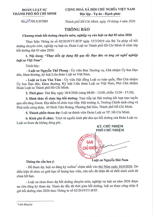 THÔNG BÁO CHƯƠNG TRÌNH BỒI DƯỠNG CHUYÊN MÔN, NGHIỆP VỤ CỦA LUẬT SƯ ĐỢT 03 NĂM 2026